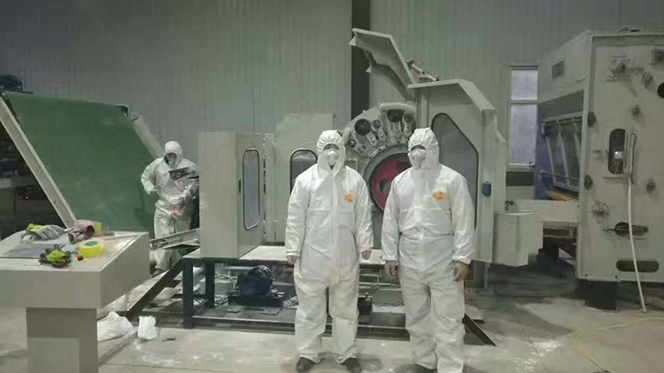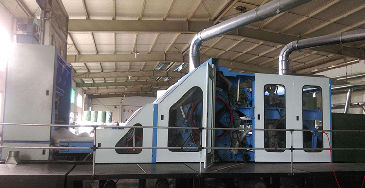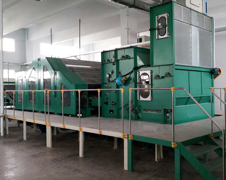 1、用途特點:適用于將滌綸、丙綸、維綸、雙組份化學纖維等纖維高速梳理成網。雙錫林梳理、雙道夫雙雜亂出棉,出棉部分帶有輸出皮簾能迅速轉移已剝棉網;采用羅拉剝棉;四根喂棉羅拉包纏金屬針布,分上、下二組配對變頻傳動,羅拉裝有防金屬保護裝置,漏底為不銹鋼。所有輥筒經定型處理,精密加工而成。徑向跳動≤0.05mm。